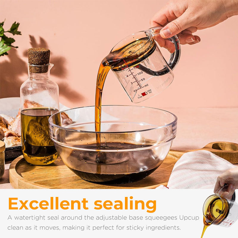 Water-tight base seal: The adjustable base features a tight, leak-proof seal that prevents spills when measuring liquids. Even better, the seal acts like a squeegee as you move the base, scraping off sticky ingredients like peanut butter, honey, or mayonnaise—no more wasted food stuck to the bottom.