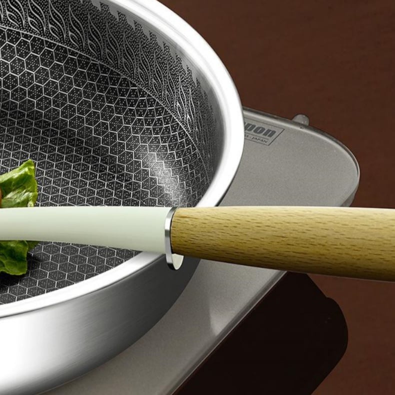 The widened 9cm spatula head fits the pan perfectly without damaging it. Ideal for high-heat stir-frying, helping you move ingredients effortlessly and evenly.
